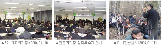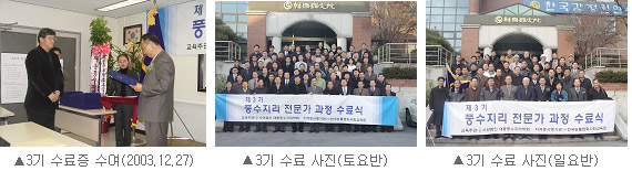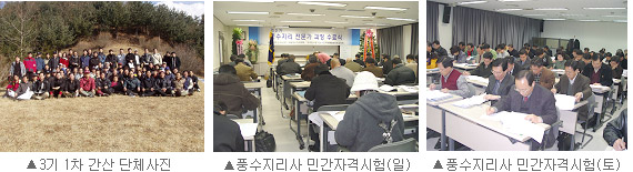 2003³â 11¿ùºÎÅÍ 2004³â 3¿ù±îÁö 110¿©¸íÀÇ Ç³¼öÁö¸®»ç¸¦ ¹èÃâÇÑ °ÁÂÀÔ´Ï´Ù. 3±â dz¼öÁö¸® °úÁ¤Àº ¸¹Àº ¼ö°»ýÀ» ¹èÃâÇϸç, ¸í½Ç°øÈ÷ [dz¼öÁö¸®Àü¹®°¡°úÁ¤]À» Çѱ¹ ÃÖ°íÀÇ Ç³¼öÁö¸® °Á·Π¼ºÀå½ÃŲ °úÁ¤ÀÔ´Ï´Ù. ƯÈ÷ 3±â °úÁ¤¿¡¼´Â ¹éµÎ»ê ¹× Áß±¹ Áö¿ªÀ» ´ä»çÇÏ¿´À¸¸ç Áß±¹ÀÇ ±¹Á¦ÁÖ¿ª¿¬±¸¿ø°ú Çмú±³·ù¸¦ Çß½À´Ï´Ù. ¶ÇÇÑ Ç³¼öÀÎÅ׸®¾î Ã¥ÀÚ¸¦ ÃâÆÇÇÏ¿© ÈÁ¦¸¦ ¸ð¾Ò´ø µ¥½ºÄí¿§ ºÎÀÎ(Àü ÁÖÇÑ ÇÁ¶û½º ´ë»çºÎÀÎ)À» ÃÊûÇÏ¿© °¿¬À» ÇÏ´Â µî ±¹Á¦ÈÀÇ ±âÃʸ¦ ´ÙÁö±âµµ ÇÏ¿´½À´Ï´Ù.